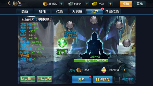 境界系统,境界需要玩家有足够的感悟值,感悟值用来修炼获得修为,修为满了之后会提升一个小境界,小境界达到10级需要破障丹进行突破,突破之后可以继续修炼,每一个大境界有低级,中阶,高阶,巅峰,圆满5个小境界,每突破一次,都会为玩家带来大量属性和战斗力的加成。