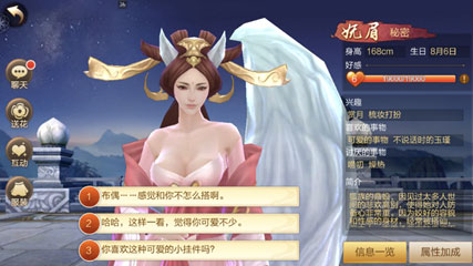 首先是聊天,这也是最省事最省钱的办法。每天能和红颜聊天两次,通过选择正确的对话选项,就能增加红颜的好感啦!当然,如果你选错的话就神马也没有啦!这时候就要考验各位大侠见风使舵的眼力了!