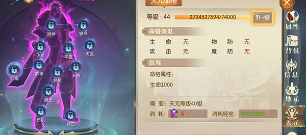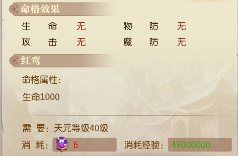 4、命格解锁后依然可以消耗天元精魄和经验值用来升级,能够大幅提升加成属性。