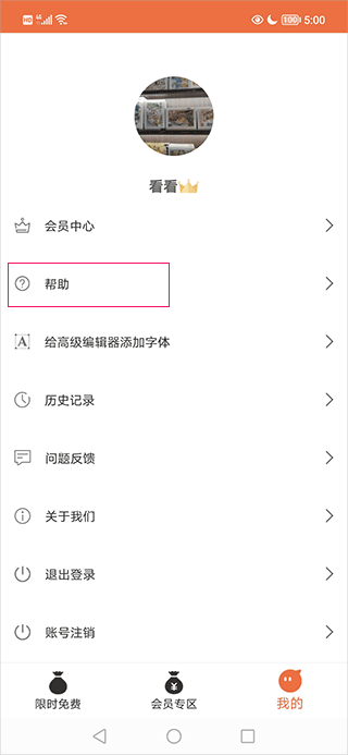 1、打开软件,在“我的”界面找到并点击“帮助”按键;