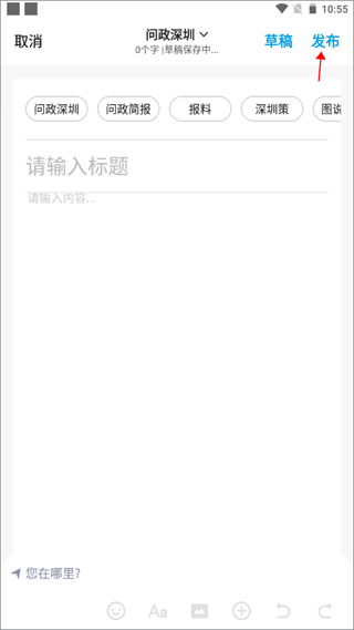 3、输入标题和内容,选择你的热点话题类型,编辑好后就可以发布出去了。