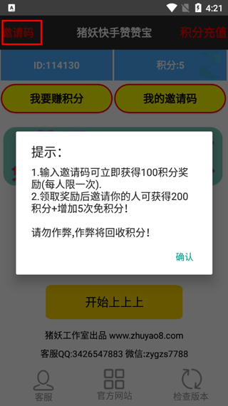 4、在我的邀请码里我们可以看到我们自己的邀请码,当有人通过我们的邀请码打开网页时就可以得到奖励积分