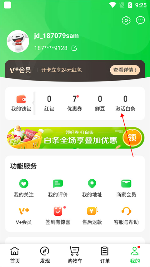 在进行白条消费时需要前往京东买菜app,即京东到家app【我的】页面中点击【激活白条】