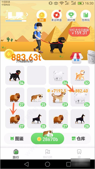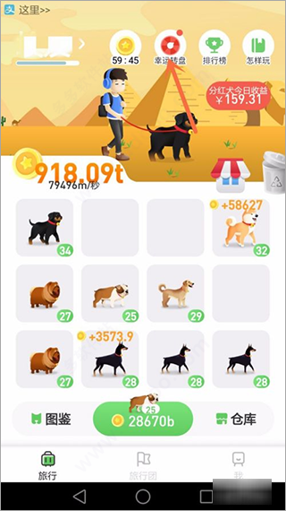 1、首先打开旅行世界主页,买狗狗把相同的狗狗拖在一起合成更高一级的狗狗,越高级的狗产生的金币越多,在合成升级过程中,可以获得随机分钟的分红犬,可以产生现金收益。