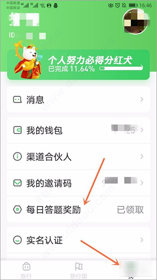 9、在旅行世界主页点击右下角【我】,找到【每日答题奖励】进入,回答三道问题即可获得金币。