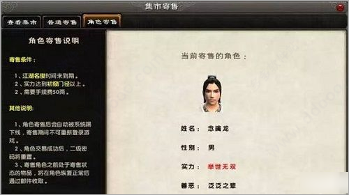 想要在蜗牛集市寄售角色,该角色需要满足两个条件,角色为明俊,并且包袱中的官银不得少于50金;