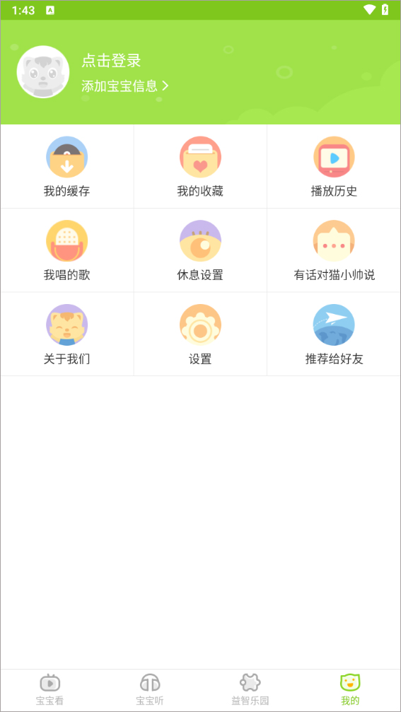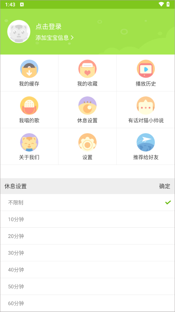 1、首先进入猫小帅儿歌app中,在我的界面中,点击休息设置