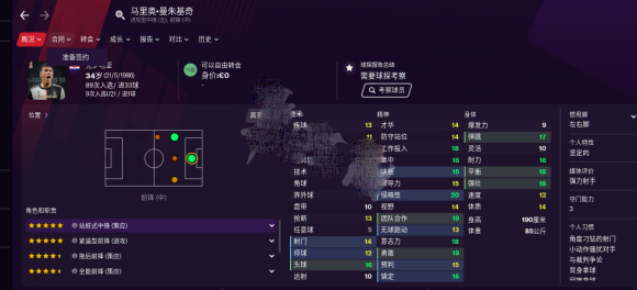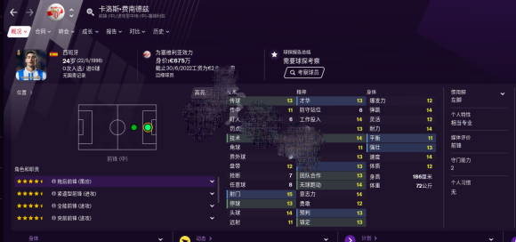 身体稍差,对于开档中下游球队来说 应该算的上好用的伪9 或者拖后,工作投入只有10。