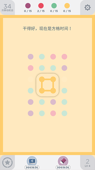 两点之间(TwoDots)可以说是脱离了三消类游戏的概念,它的主要玩法是通过连线的方式,将相同颜色的圆点连起来消除。可以连接的圆点数量并没有限制,不过需要注意只可横竖相连,不可斜连;也就是说我们可以一次进行2消、3消、4消甚至是全消。全消就像是炸弹:只要连接时形成一个正方形,即从起点出发能在回到终点,那么当前所有该颜色的圆点都会消除,全消是这款游戏中达到目标最便捷的方法,我们通过2消、3消更多的目的就是使相同颜色的圆点排成正方形,成为一个全屏同色炸弹!