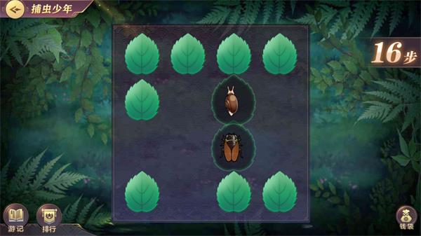 玩家可点击翻开叶子查看背后的昆虫,翻开两张叶子后若昆虫相同则配对成功叶子消失,若未配对成功则叶子翻回。当玩家配对完全部昆虫后游戏结束。