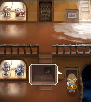 沿着楼梯下来到下层,调查右边的迷之机器,发现其身上有一个发条插口,将发条插入,发现可以旋转,但是并没有什么反应。