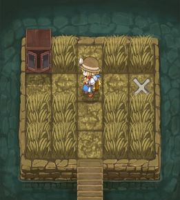 回到初始房间进入3号门,直奔右上角稻草处,使用镰刀将稻草砍开,拾取钥匙。