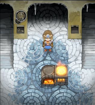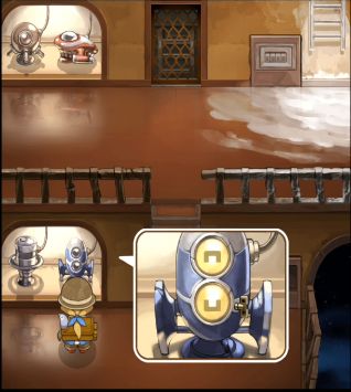 此时把身上的齿轮放入最下方的齿轮格子中,用热水融化中间的齿轮(用来打开火炉房左边柱子的机关),发现左侧的机关门又关上了,拿起最下方的齿轮,放入最上方齿轮格中,然后再次运行机器,让左侧的机关门打开,回到火炉房。