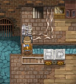 使用水杯河道中装满水,使用箱子返回对岸后将箱子回收,然后回到出发点,将小车推向右侧,然后使用箱子在电机的正下方搭桥,来到电机处,使用带水的杯子将电机损坏,此时拦路的电流已经失效,但不要着急过关。