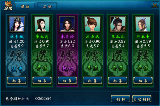 在招募界面左下方有一个免费刷新时间,每1小时有1次免费刷新将领的机会。当免费时间,别犹豫就用它了。酒馆里每次刷新出6名随机将领。当免费时间没有到时,也可以使用仙石或者礼券刷新酒馆。一般手动刷新几次就可以出蓝色品质以上的散仙,自动刷新可以选择将领的品质,以及最大刷新次数。仔细看散仙的“潜力”和“资质”,这是决定散仙强弱的重要标志。