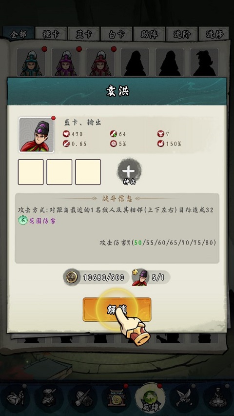 4、游戏主线就是通过招募,不断收集武将,武将可通过助阵、进价以及升级等方式,进行强化。