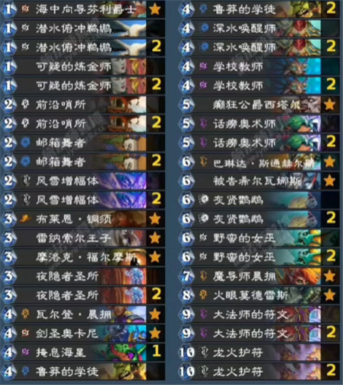 T2:伟大的阿卡扎曼扎拉克(4.25),伊妮·积雷(4.27),厨师曲奇(4.28),米尔豪斯·法力风暴(4.28),菌菇术士弗洛格尔(4.30),奥拉基尔(4.30)