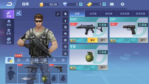 4、在仓库里,玩家可以查看自己已经装备的武器,也可以卸下装备,和使用道具等。