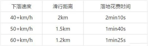 经过测试在40km/h时的滑行距离最远,达到了2km,大于和小于40km都会较小滑行距离,并且小于40km/h的速度时,滑行的时间太长,严重影响降落效率,因此如果选择“呼吸跳伞法”,保持40km/h的速度可以达到现在版本最远的2km,也就是地图上两个大格的距离。