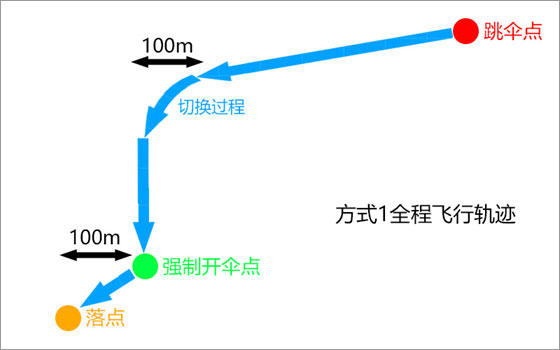 后段是长按方向控制按键并将视角降到最低(垂直降落,最快纵向速度)。而方式2是长按方向控制按键,全程都面朝开伞点飞行。这两种方式在到达开伞点的效率是上完全一致的,但是开伞时初始速度有明显的差别