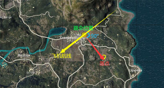 先为大家介绍一下跳伞时机的选择,首先确定你要降落的地点,因为飞机的速度是快过玩家飞行的速度,所以我们在跳伞时要选择距离降落点最近的位置,也就是跳伞点与降落点连线垂直于航线的位置。