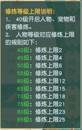 修炼可以提升角色、侠客、宠物的百分比属性;修炼上限与人物等级有关。每次修炼会消耗银币、帮贡、秘参、鹿茸、灵芝等。