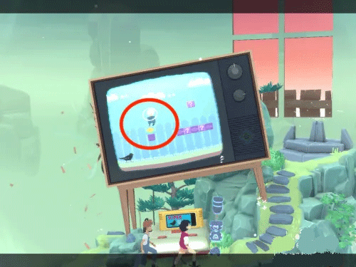 1、往前走,点击蓝色方块,把电视机的电源线插上。然后往回走,让小男孩点击遥控器,接着顺着影带往上走。