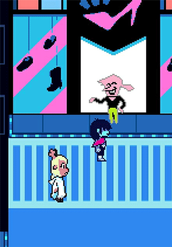 接下来就是我们的最终boos,——Spamton。这个就是之前待在垃圾桶中的神秘人,他趁玩家打冰封线的乱子去城堡的地下室偷取武器,然后成为了赛博世界的新统治者,便阻止玩家关掉黑暗喷泉