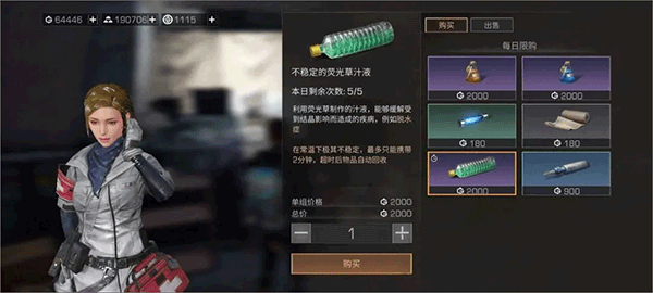 2、在方舟市地图,传送至“药店”,与药店店长格瑞丝对话后,打开商店,使用2000新币,购买1个“不稳定的荧光草液汁”,需要注意的是,在常温下,该液体会变得极不稳定,玩家最多只能携带2分钟,超时,物品会自动回收。