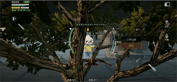 2、任务道具在她背后的树上,玩具可以使用无人机或者蒸汽背包将其拿下来,建议使用误无人机,放飞无人机后,点击“手动操作”,右侧控制无人机上升,靠近小熊后,点击“吸起”,再点击“放下”,小熊就会落在地上。
