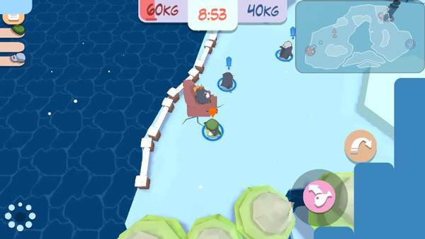 以上为玩家朋友简单的介绍这款游戏的相关操作,接下来再说一下当玩家进入游戏后,会在上方显示当前比赛的比分情况和比赛所剩下的时间,虽然操作相对于简单一些,但作为竞技类游戏紧张的气氛还是很浓类,容不得片刻容缓。而在玩家们持鱼的情况下,点击拖拽就能进行瞄准扔鱼的方向,扔出鲑鱼,以便增加自己的移动速度。