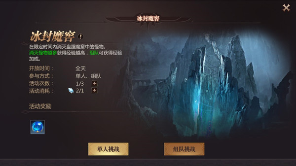 1、冰封魔窟是游戏中获得经验值最多的副本之一,是每日必做副本任务之一;副本主要是刷怪获得经验,可单人进行挑战也可组队,组队经验会大于单独挑战。