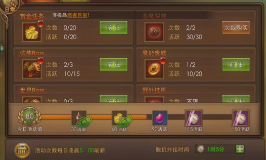 2)每日的活跃奖励,只要达到100和130,都可以获得1张5小时的挂机外挂时间 。