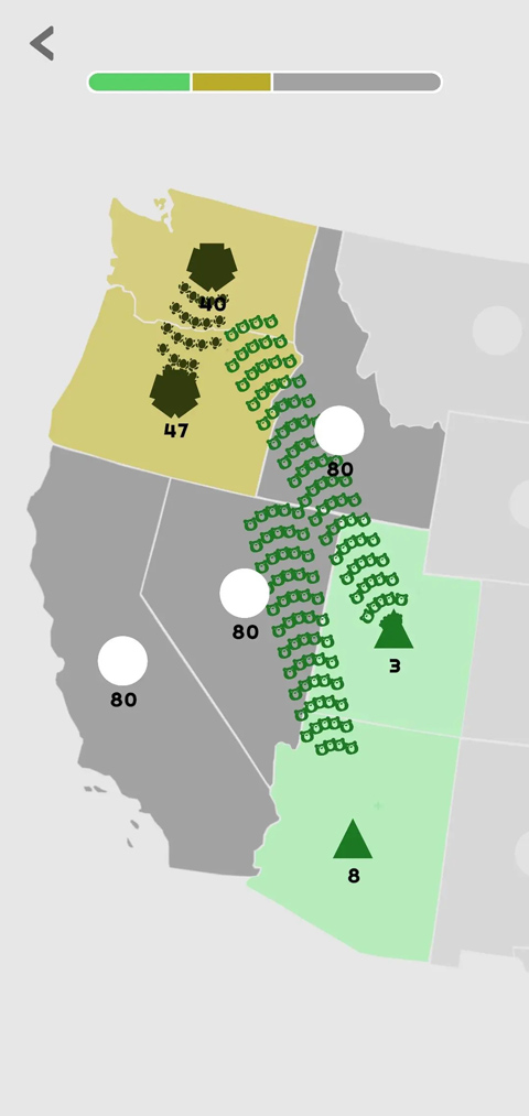 3、点击拖动地图块中间的圆点,即可表示派遣单位进行攻击扩张,圆点旁边的数字表示单位数量,单位数量会随着时间自动增长,数量越多,地图块的颜色也就越深。