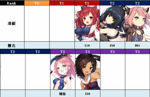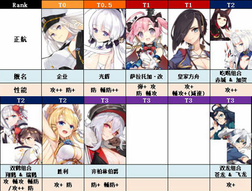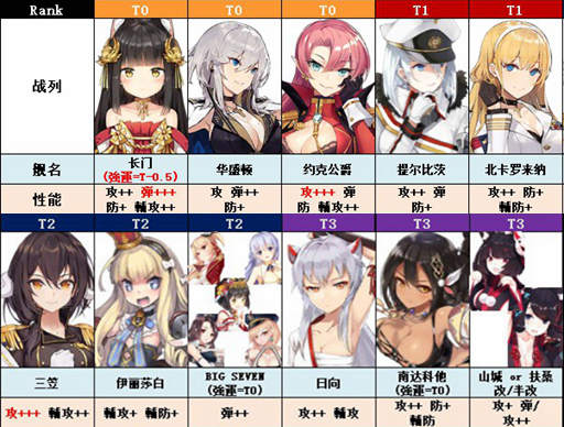 本榜为限制数量的优胜劣汰制度,即限定T0只有一艘,T1两艘等,除非存在完全绑定组合,或者同质姐妹船,又或者能力太过出色和其他船对比度显著的。换句话说,本榜的意义在于,在没有真爱的前提下,你可以把资源只提供给T0级船,并且每个舰种只用练极少数量就足以应对各种局面。