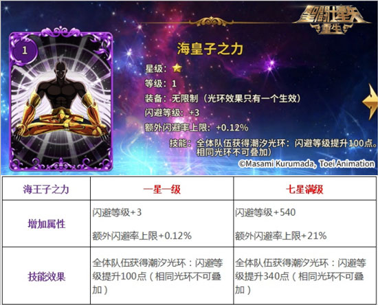 若是论提升阵容的整体闪避效果,就不得不先提一下海皇子之力这张闪避光环究极之力。装备无位置限制。升级提升闪避等级和额外闪避率上限的百分比,升星提升全体队伍闪避等级的光环效果。笔者认为这种究极之力对提升装备者的闪避效果是显著的(增加了很多闪避等级以及额外的闪避率上限)。装备时需注意两点:一、光环效果只有一个生效,二、相同光环不可叠加。如果要装备此卡,尽量避免装备如念动力等其他光环效果的究极之力,以免冲突,导致海皇子之力的光环效果失效。