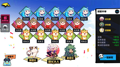 应援团员推荐:经验妹、光剑男和风车汪这一整套提供了九尾狐前期需要的较高法强法穿,经验妹增加的少量经验可以让九尾狐更快的升到4级,风车汪增加的4%移速可以让九尾狐更快的游走支援。