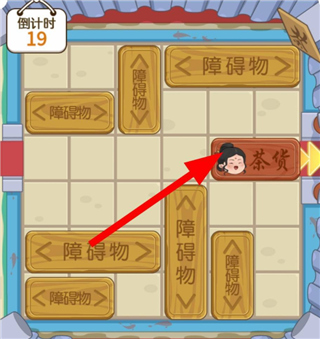 1、将障碍物都分到上下两边,让茶货走到右边箭头处完成华容道游戏;