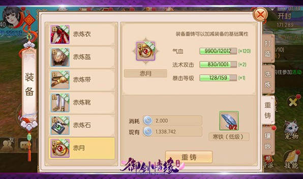 这个时候我们可以再点开打造界面的重铸栏来查阅该装备的现有属性和属性上限,如果对自己打造的装备属性不满意,可以再通过分解其他装备获得的“寒铁”来对装备进行重铸,重置它的属性(有几率倒扣属性,所以重铸前请谨慎考虑)。