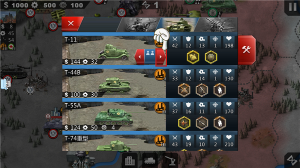游戏有四种模式:军团模式可以组建自己的军队,挑战各种战役;统治模式能培养将领,完成任务并建造建筑;剧本模式重现了真实历史战役,比如敦克尔克和中途岛海战;征服模式则允许玩家选择国家,调整外交策略,争夺领土。操作很简单,适合新手上手,通过触摸屏幕指挥部队,还能在不同地形中制定攻防策略。
