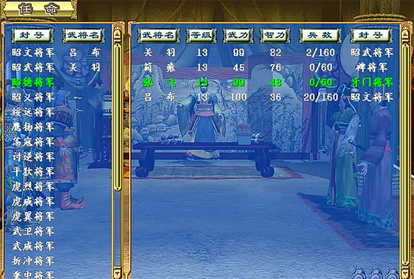 这样的话就可以直接离间吕布了,大概离间8次后就可以招降吕布,这样的话刘备军就有5个将领了。离间吕布的原因也是为了给比武夺冠有一个保障。吕布的武力还是摆在那里的。