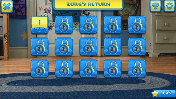 3、接着将攻击范围调整到需要攻击的目标上,松开手指,巴斯光年手中的“弹药”便会朝着目标砸去。只要能让怪物们从建筑物上坠落至地面,就可顺利通关。1、进入游戏后,点击中间的红色方框内的按钮进入主菜单;