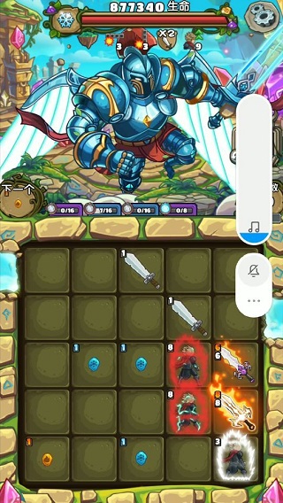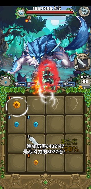 游戏的伤害是以装备的卡牌的战力总和作为基础攻击力(到玩家等级21级共可装备五张卡牌),然后英雄加成,剑火加成。总体可以看成翻倍翻倍翻倍,8级英雄8级元素8级剑就是8*8*8=512倍,最高可打出1024倍输出。温馨提示:长按棋牌可以看见数字的倍率。游戏中还有一个暂存区,上面的物件可以和棋牌上的任一物件交换,20回合冷却。每个关卡会有三个成就,满足其条件可以获得符文,符文可用来解锁被动技能和升级第一技能。