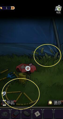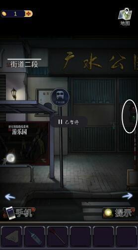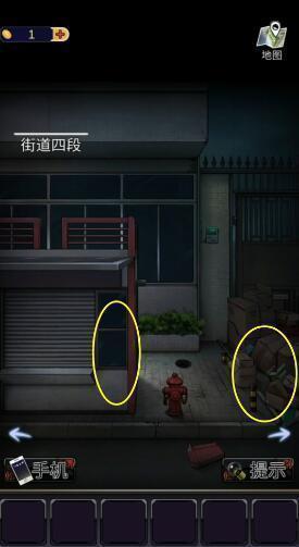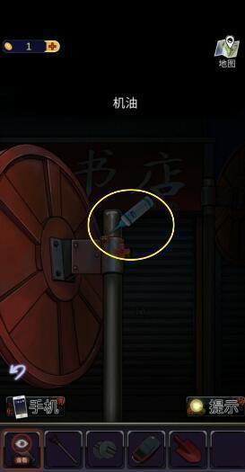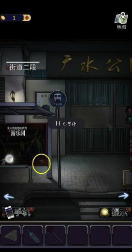 1、点击箭头来到街道四段,点击下图圈出的位置,获得【纸条碎片】、【铲子柄】和【机油】。