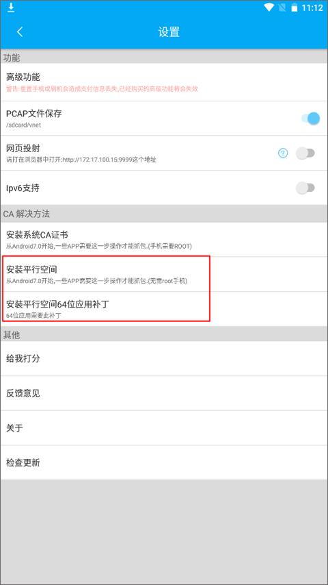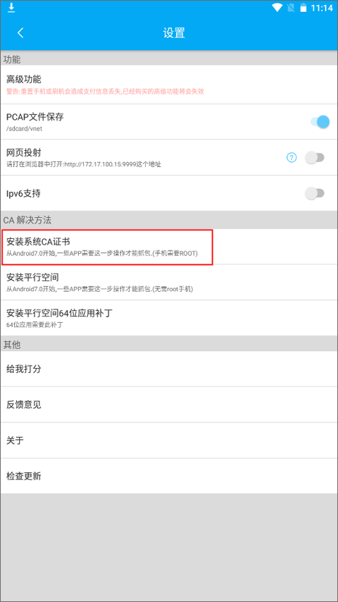 这个抓包功能支持Android7.0以上。Android7.0 以上无法通过安装用户证书抓取HTTPS,所以需要额外的操作,以下二选一: