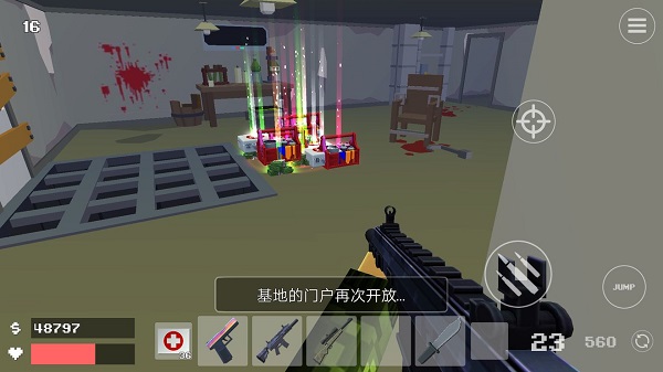 操作,对于这款游戏来说,也是一个不可忽视的重点,左边摇杆,右边可以控制跳跃、射击,可以说非常的简单,玩家们熟悉一下,基本就能流畅行动了。在中间我们也可以看到一排道具摆放的位置,药箱啊、武器啊,点击就可以使用了。