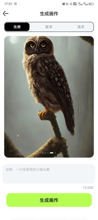 3、左滑到免费框,左右滑动,选择一种风格,根据关键字,点击生成画作;