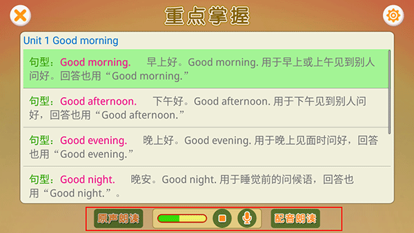 4、深圳小学英语课本音频app可以点击课文为你逐句朗读,学会朗读每一个句子的细节部分;