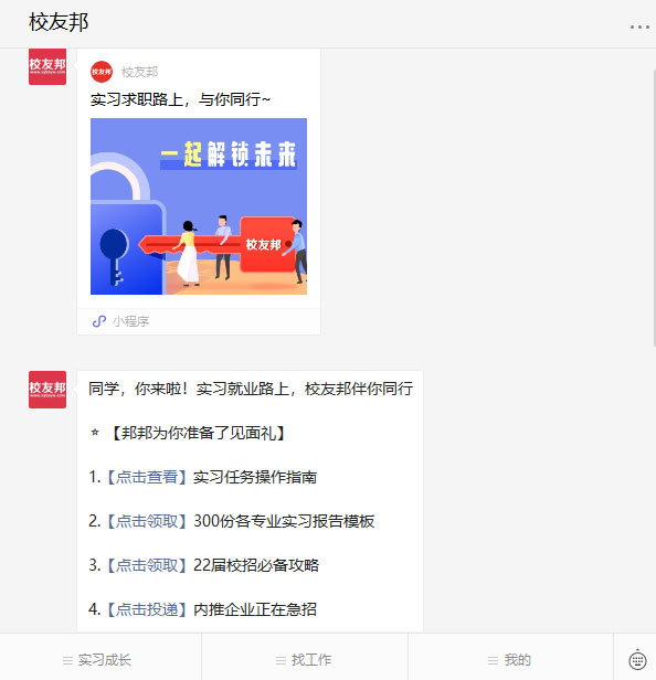 扫码后,用户可以随意点击实习成长,找工作,我的等选项进入校友邦小程序;