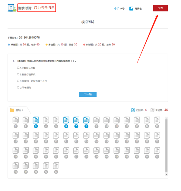 7、点击“交卷”按钮时,如果有未做完的题目,会弹出提示:“还有XX题未做,是否交卷”,您可选择继续答题或确定交卷。确定交卷后,平台会即时弹出考试成绩,会显示您的考试是否合格。